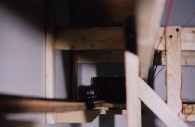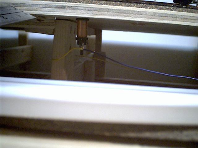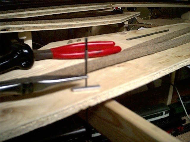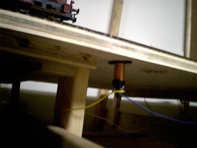 Here the locomotive is re-entering the layout room through the lower hole from the furnace room. You can see the two main wire buses in the upper right of the picture - the ground bus is a bare 12 gauge wire, and the main power for the layout is supplied by the 12 gauge red insulated wire. Since I'm now definitely using digital locomotive control from the outset, wiring for different blocks etc. is significantly reduced.