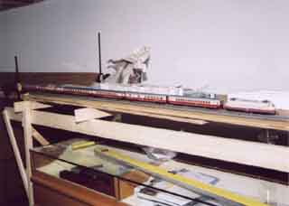 The furniture in these pictures are display cases from my father's old Mens' Wear Store (Esquire Custom Tailors). They are excellent for storage and the top level has glass display possibilities - always nice. They have castors installed so they can be rolled out of the way to work under the layout as shown below. The class 103 is setup to check the size of it pulling 6 27cm passenger cars and provide a little excitement to my kids. They were very sad when I put the trains away again to continue construction, they wanted trains to run! In fact Owen started to cry when I was putting the train away.
